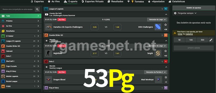O 53Pg oferece uma grande seleção de opções de apostas em e-sports com probabilidades competitivas